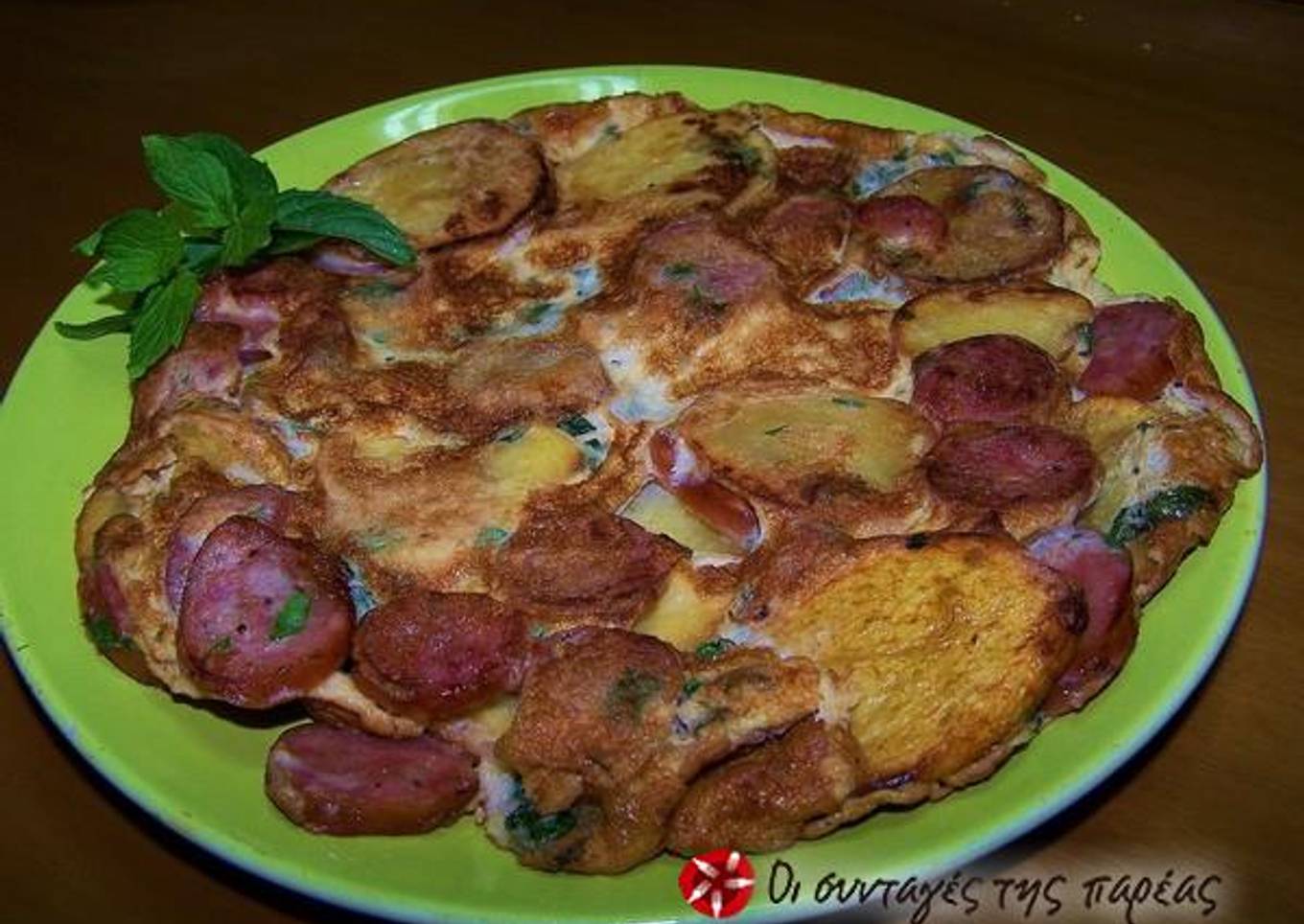 - Beat the eggs and add salt, pepper, the finely chopped fresh spearmint and the sausages or cold cuts in pieces to the mix.