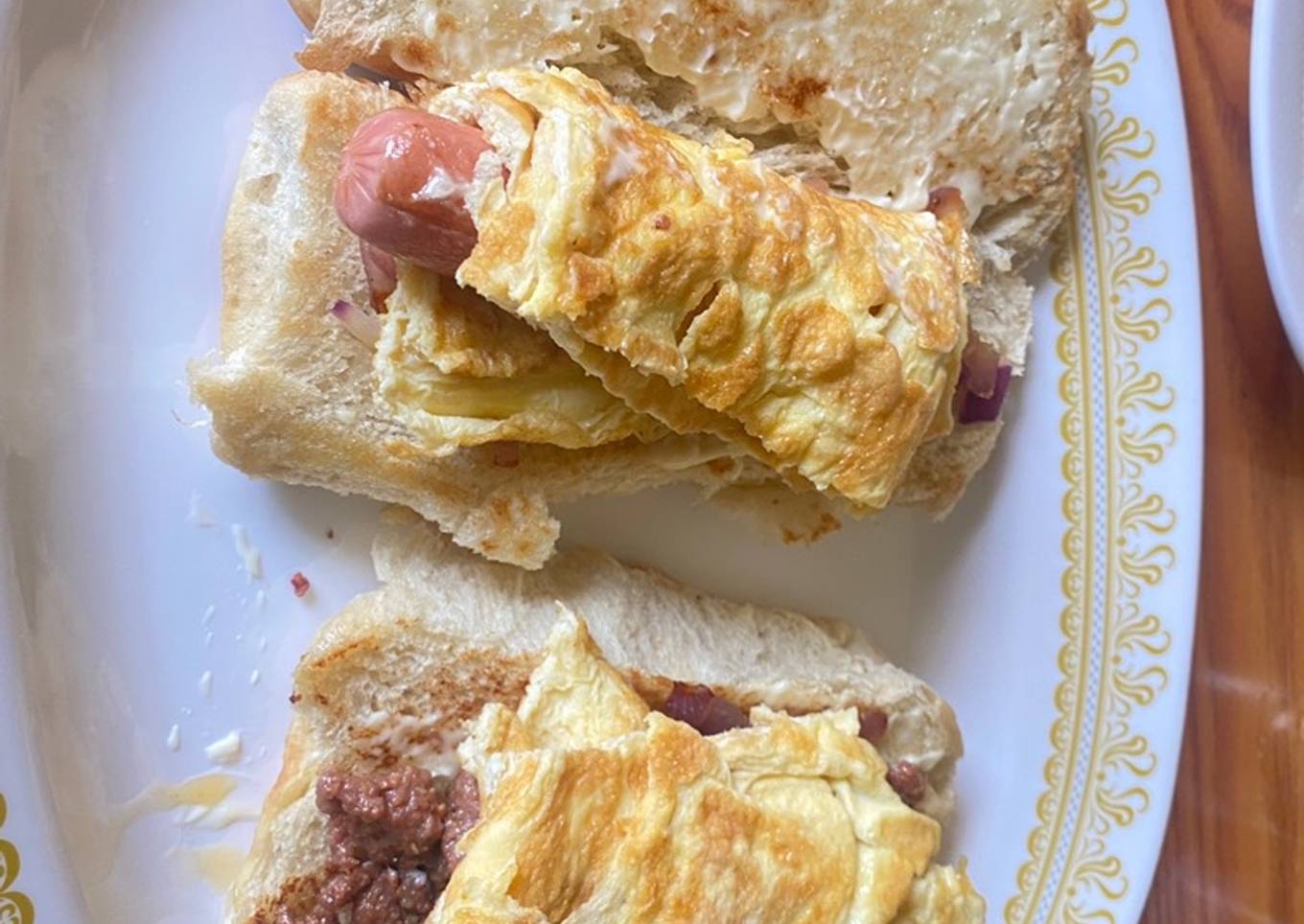 - Wrap 2 of the egg pieces around the sausages and the other 2 around the minced meat, place it on each of the bread and cover.