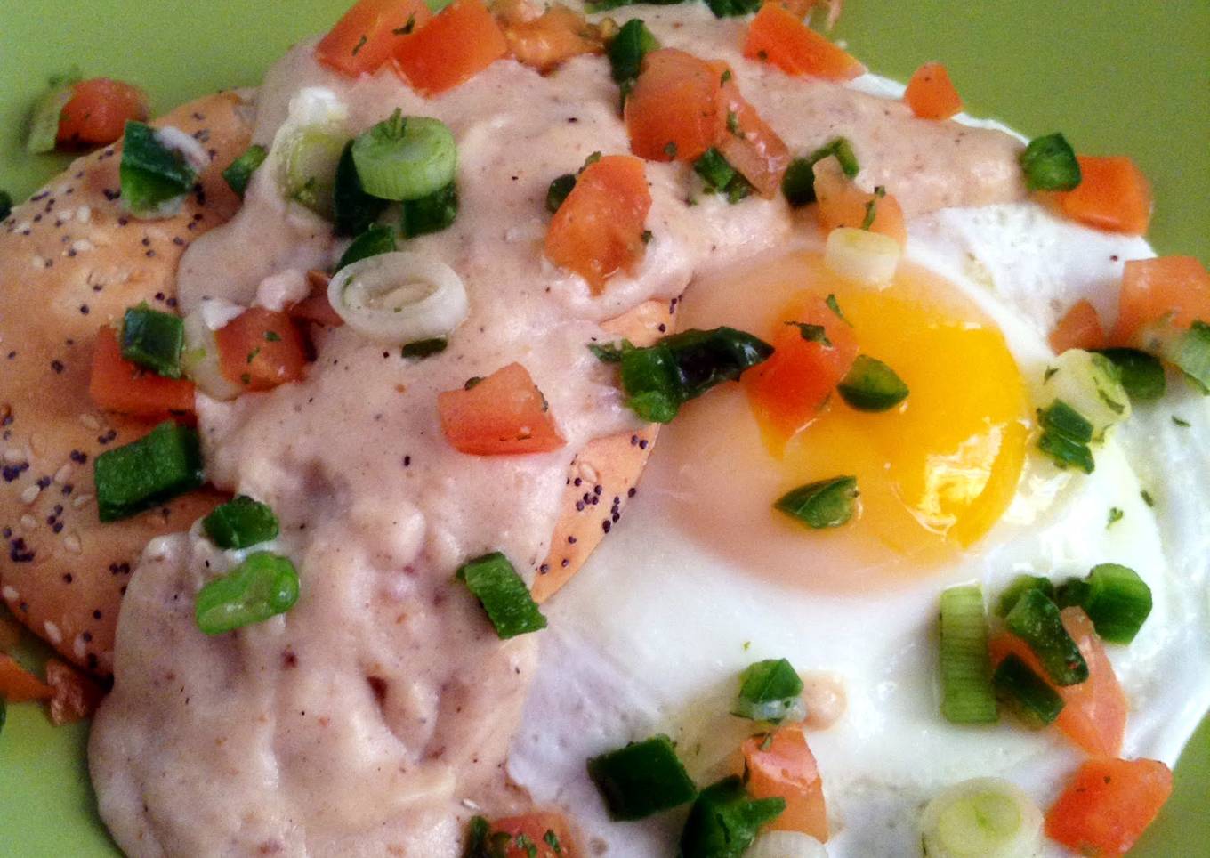 - Place the bottom of the bagel on serving dish, pour gravy over and top with egg. Put your bagel top slightly to the side of the egg. I topped mine with diced tomatoes and jalapeƱo peppers.